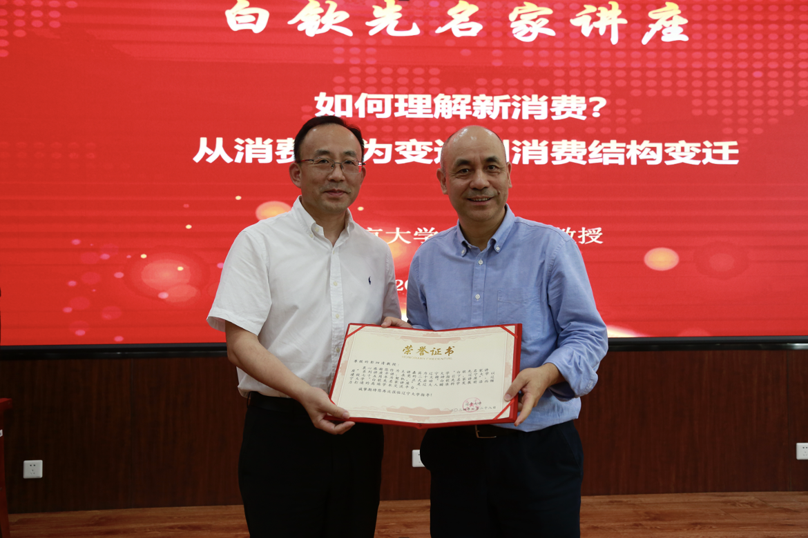 讲座结束后,M体育平台·(中国)官方网站党委常委、副校长仇焕广教授为彭泗清教授颁发了“白钦先名家讲座”纪念证书。M体育平台·(中国)官方网站品牌管理研究中心主任袁少锋教授为彭泗清教授赠送纪念照片。M体育平台·(中国)官方网站商学院青年教师为彭泗清教授献花致敬。