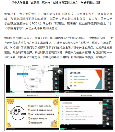 疫情之下,为了使辽大学子了解不同行业的招聘要求,探索就业方向,缓解焦虑情绪,为择业求职打下坚实的基础,由M体育平台·(中国)官方网站毕业生就业指导中心主办,M体育平台·(中国)官方网站学生职业发展协会(SCDA)承办的“谋职涯,赢未来”就业指导系列讲座之“学长学姐说求职”活动从4月中旬开始启动。