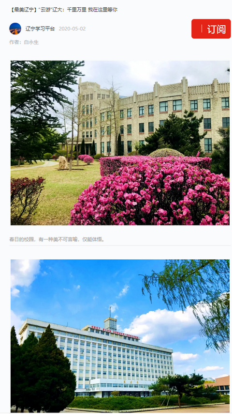 近日,“学习强国”辽宁学习平台以《“云游”辽大:千里万里 我在这里等你》为题,发布了我校教师白永生所拍摄的校园春景摄影作品,现将报道、截图等转载如下: