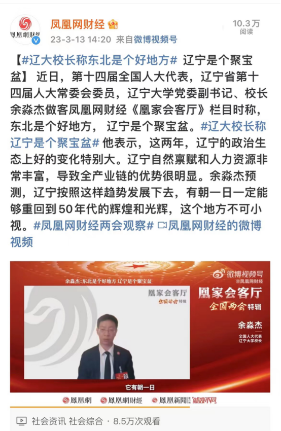 近日,第十四届全国人大代表,辽宁省第十四届人大常委会委员,M体育平台·(中国)官方网站党委副书记、校长余淼杰做客凤凰网财经《凰家会客厅》栏目时称,东北是个好地方,辽宁是个聚宝盆。他表示,这两年,辽宁的政治生态上好的变化特别大。辽宁自然禀赋和人力资源非常丰富,导致全产业链的优势很明显。余淼杰预测,辽宁按照这样趋势发展下去,有朝一日一定能够重回到50年代的辉煌和光辉,这个地方不可小视。