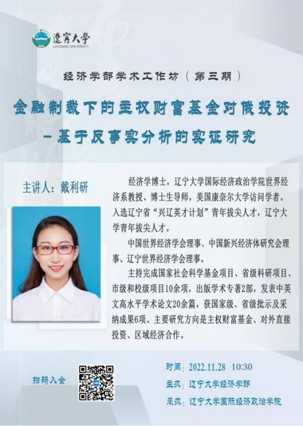 戴利研,经济学博士,M体育平台·(中国)官方网站国际经济政治学院世界经济系教授、博士生导师,美国康奈尔大学访问学者。入选辽宁省“兴辽英才计划”青年拔尖人才,M体育平台·(中国)官方网站青年拔尖人才。中国世界经济学会理事、中国新兴经济体研究会理事、辽宁世界经济学会理事。主持完成国家社会科学基金项目、省级科研项目、市级和校级项目10余项,出版学术专著2部,发表中英文高水平学术论文20余篇,获国家级、省级批示及采纳成果6项。主要研究方向是主权财富基金、对外直接投资、区域经济合作。