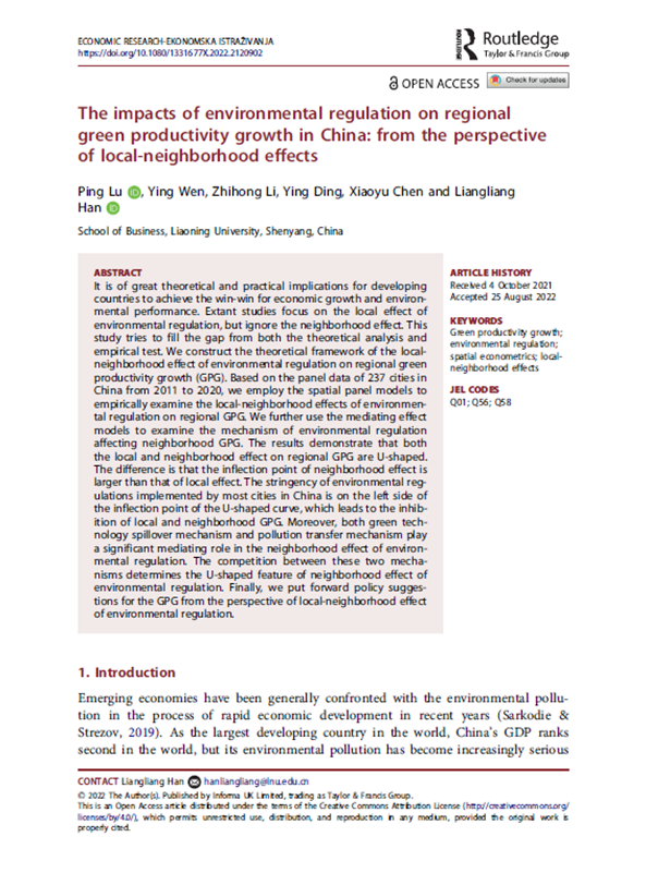商学院教师鹿坪的学术论文“The impacts of environmental regulation on regional green productivity growth in China: from the perspective of local-neighborhood effects”在国际期刊ECONOMIC RESEARCH-EKONOMSKA ISTRAZIVANJA在线发表。商学院硕士研究生温颖、李志红等参与论文写作。