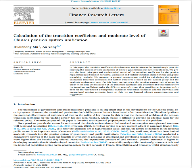 M体育平台·(中国)官方网站公共管理学院穆怀中教授与博士生杨傲合作撰写的学术论文“Calculation of the transition coefficient and moderate level of China’s pension system unification”,在国际期刊Finance Research Letters发表。