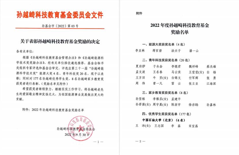孙越崎科技教育基金会是1992年10月由朱学范、钱伟长、程思远等20位知名人士倡议创立。孙越崎基金委员会设有孙越崎能源科学技术奖,该奖项1992年设立,是经国家科技奖励办公室批准的正式奖项,包括“能源大奖”、“青年科技奖”、“优秀学生奖”、“家乡教育奖”,每年评审并颁奖一次,该奖项为推动我国能源领域科技创新做出了重大贡献。本届共评选出孙越崎“能源大奖”4名、“青年科技奖”20名、“优秀学生奖”177名、“家乡教育奖”8名。“能源大奖”获得者在能源基础理论突破和科技进步方面做出了重大贡献,历届获奖者中有多位当选中国科学院或工程院院士。