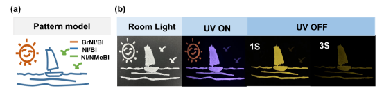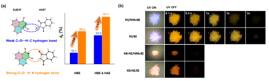 图1. a 基于1,8-萘酰亚胺和邻苯二甲酰亚胺的主客体掺杂体系;b发光照片