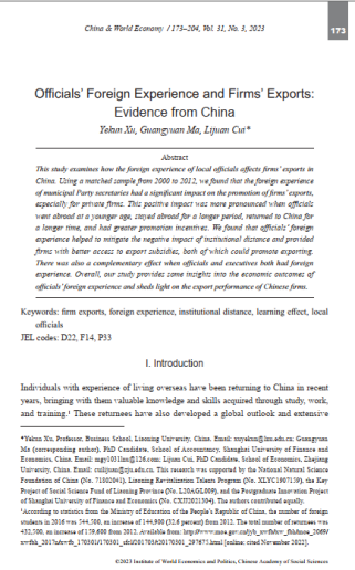 商学院徐业坤教授作为第一作者的合作论文Officials’foreign experience and firms’ exports: Evidence from China 2023年5月在国际期刊China & World Economy发表。