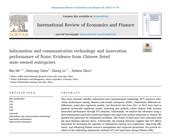 近日,经济学院李政教授(通讯作者)与其研究团队共同完成的论文Information and communication technology and innovation performance of firms: Evidence from Chinese listed state-owned enterprise在国际期刊International Review of Economics and Finance在线发表。