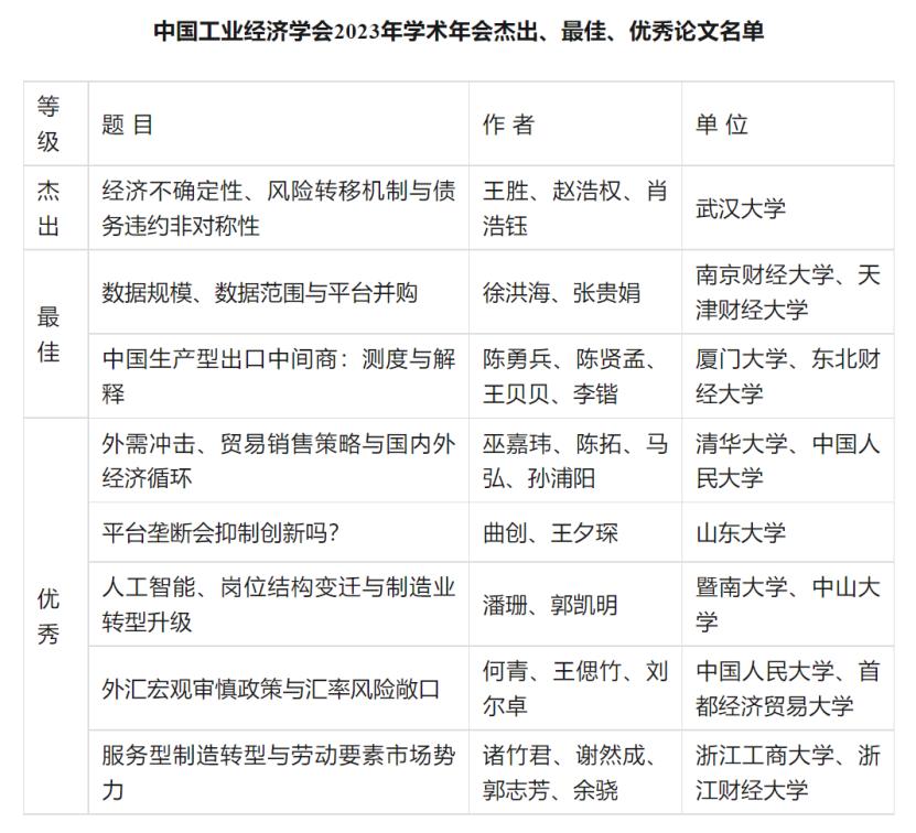 于立等8位教授为中国工业经济学会2023年学术年会获奖论文作者颁发证书