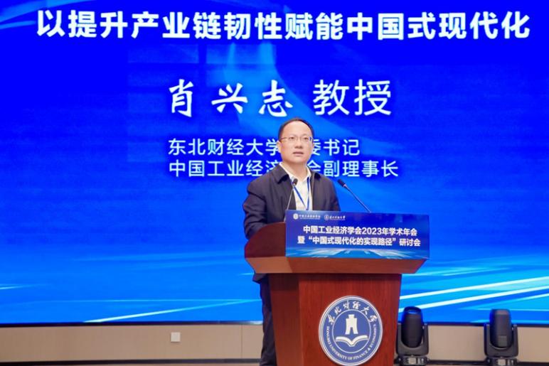 肖兴志教授以“以提升产业链韧性赋能中国式现代化”为题作主旨演讲,阐释了产业链韧性和中国式现代化的关系,从宏观逻辑、本土逻辑、微观逻辑、政策逻辑四个方面解析了产业链韧性的生成逻辑,提出通过坚持科技自立自强,为提升产业链韧性提供“补链”支撑;大力发展数字经济,为产业链韧性扩展开拓“强链”场景;健全产业链图谱,为提升产业链韧性厘清“延链”思路;推动创新链、产业链、资金链、供应链“四链”融合的产业链韧性提升路径。最后,对产业经济学学科领域产业链韧性研究中的重点问题、发展方向与趋势进行了展望。
